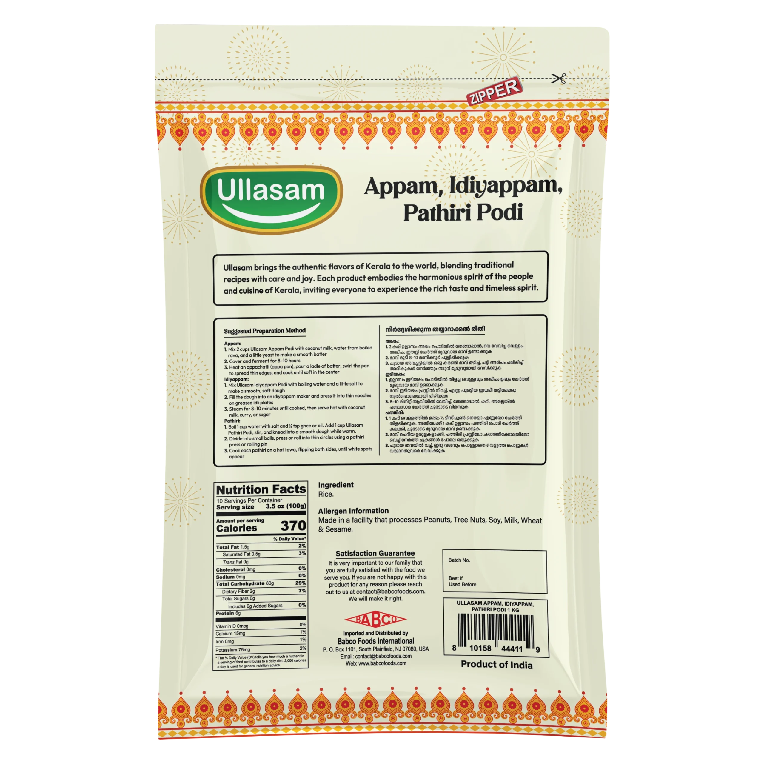 Ullasam Appam, Idiyappam, Pathiri Podi is a versatile, traditionally prepared rice flour blend made from carefully selected rice and processed to deliver soft appams, delicate idiyappams, and thin, tender pathiris with authentic taste and texture. Finely milled for smooth consistency and reliable results, it supports perfect fermentation and cooking every time. Ideal for everyday meals and traditional Kerala recipes, Ullasam Appam, Idiyappam, Pathiri Podi brings convenience, purity, and true South Indian culinary tradition to your kitchen.
