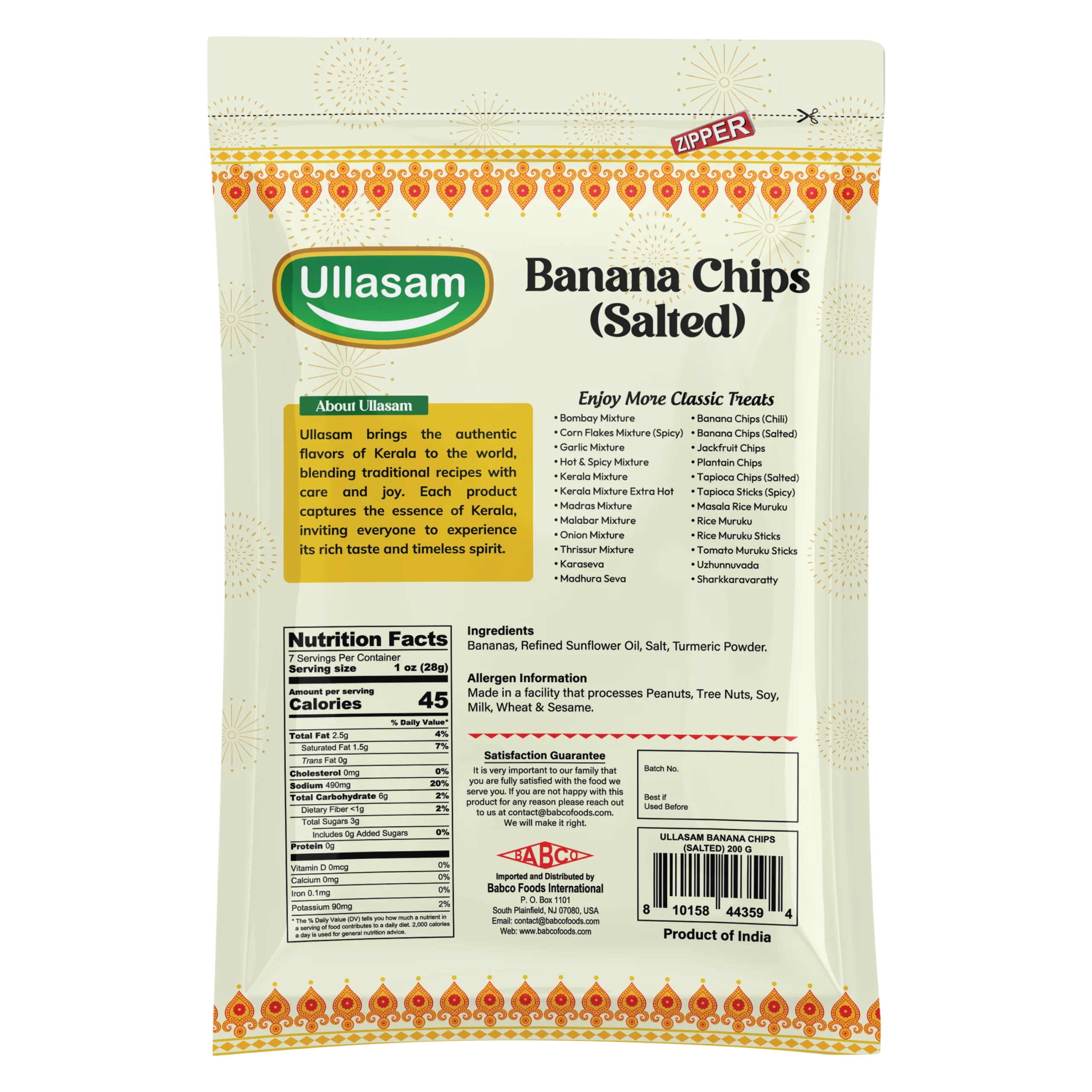 Ullasam Banana Chips (Salted) are classic Kerala-style snacks made from carefully selected raw bananas, thinly sliced and fried to golden crispness. Lightly seasoned with salt, they deliver a clean, natural taste and satisfying crunch in every bite. Perfect for tea-time or everyday snacking, Ullasam Banana Chips (Salted) bring authentic Kerala tradition and timeless homemade goodness to your snack moments.