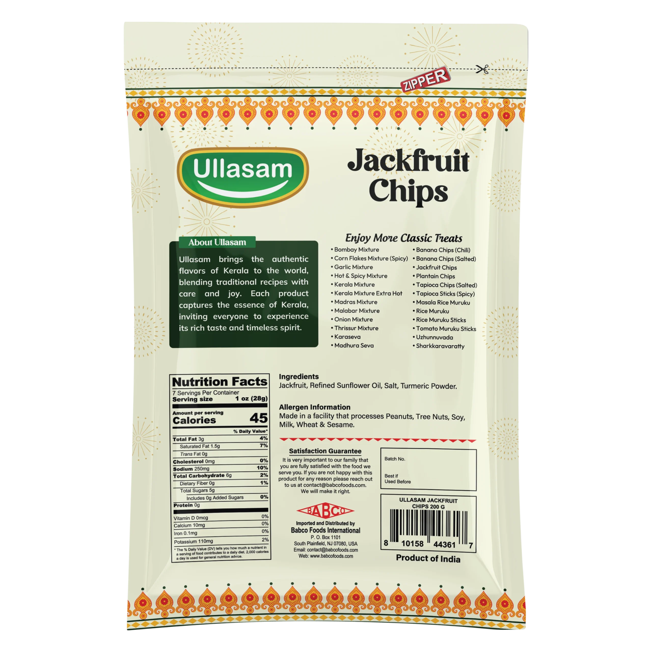Ullasam Jackfruit Chips are traditional Kerala-style snacks made from carefully selected raw jackfruit, thinly sliced and fried to golden crispness. Naturally flavorful with a mild sweetness and satisfying crunch, each chip offers a unique taste rooted in regional tradition. Perfect for tea-time or anytime munching, Ullasam Jackfruit Chips bring authentic Kerala flavor and timeless homemade goodness to every bite.