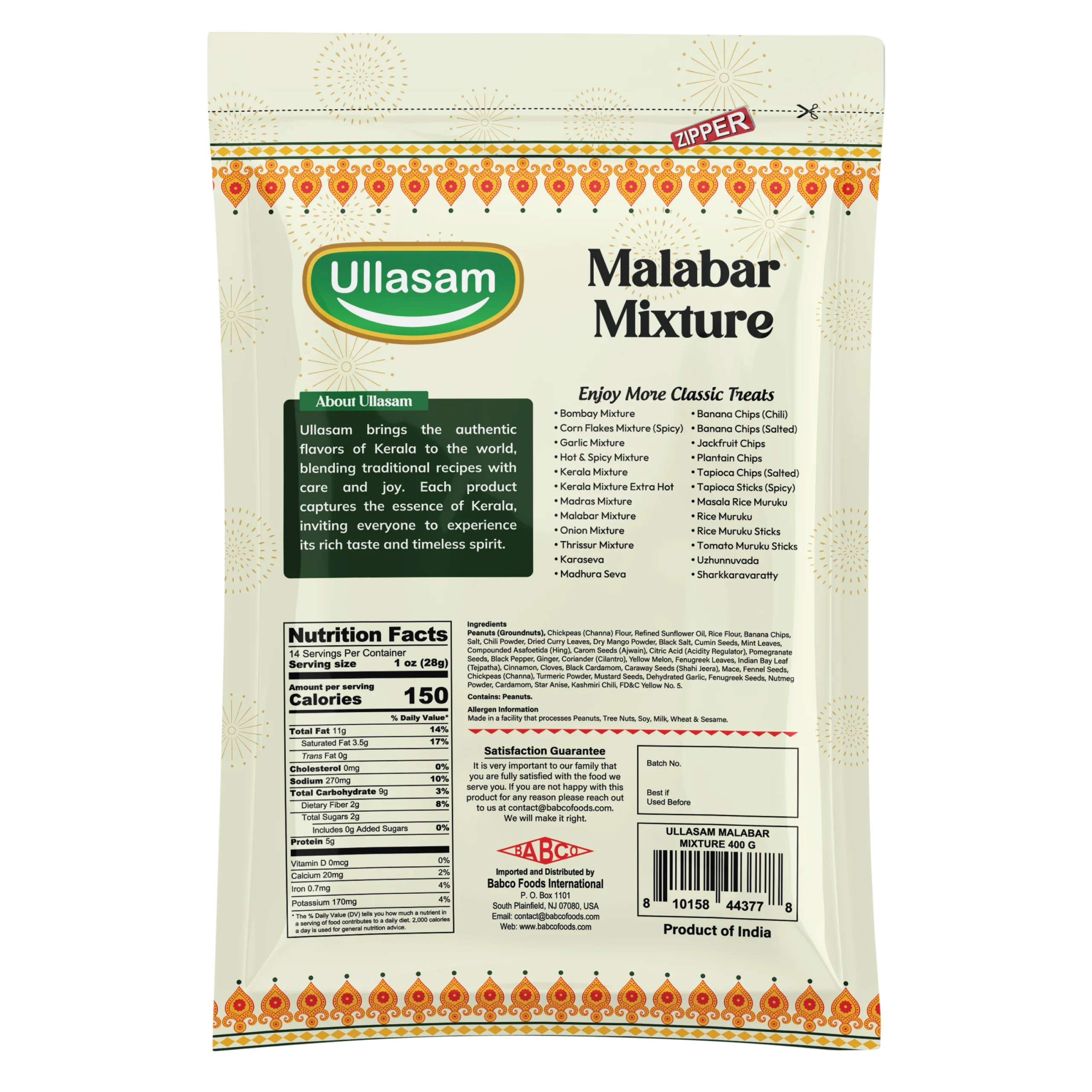 Peanuts (Groundnuts), Chickpeas (Channa) Flour, Refined Sunflower Oil, Rice Flour, Banana Chips, Salt, Chili Powder, Dried Curry Leaves, Dry Mango Powder, Black Salt, Cumin Seeds, Mint Leaves, Compounded Asafoetida (Hing), Carom Seeds (Ajwain), Citric Acid (Acidity Regulator), Pomegranate Seeds, Black Pepper, Ginger, Coriander (Cilantro), Yellow Melon, Fenugreek Leaves, Indian Bay Leaf (Tejpatha), Cinnamon, Cloves, Black Cardamom, Caraway Seeds (Shahi Jeera), Mace, Fennel Seeds, Chickpeas (Channa), Turmeric Powder, Mustard Seeds, Dehydrated Garlic, Fenugreek Seeds, Nutmeg Powder, Cardamom, Star Anise, Kashmiri Chili.