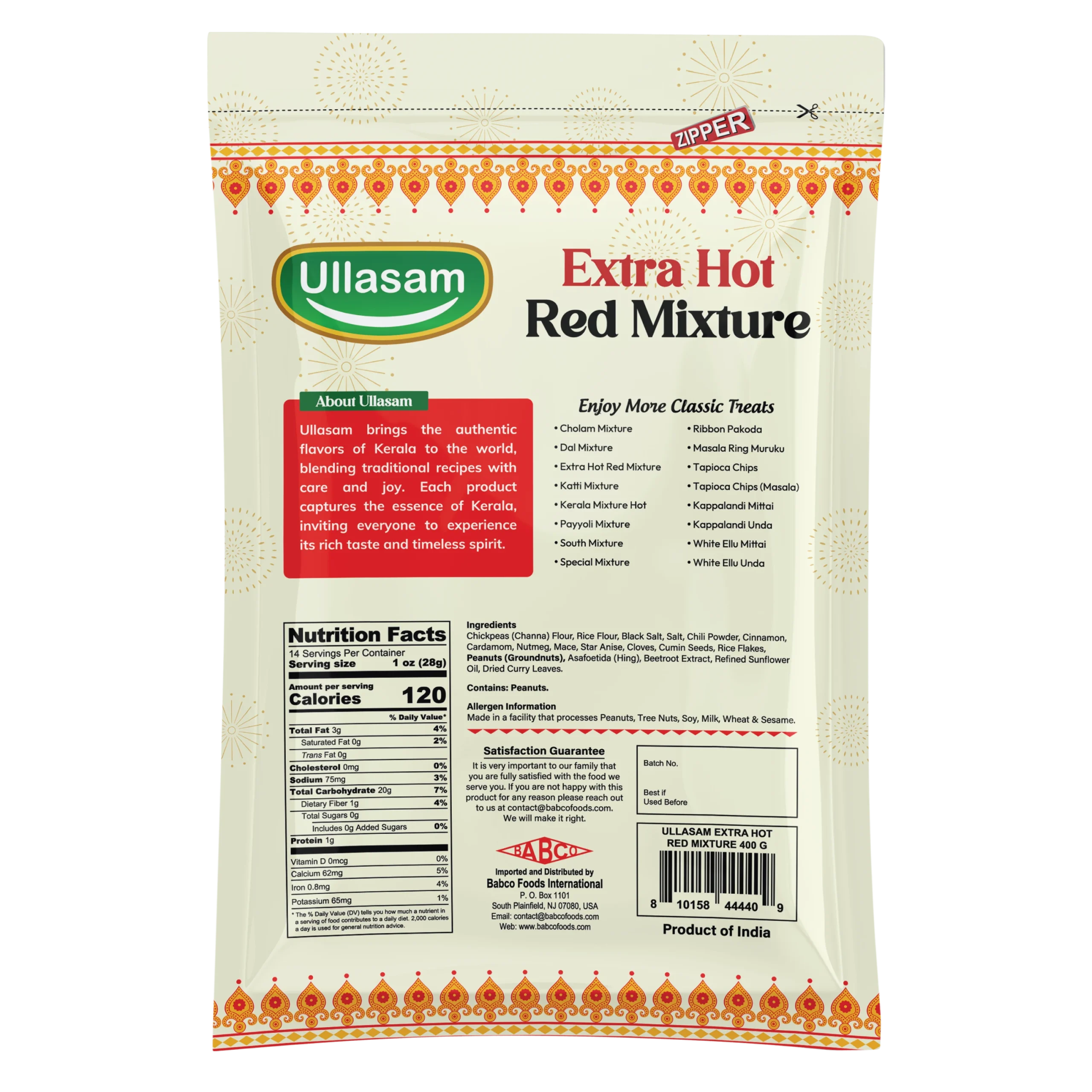 Chickpeas (Channa) Flour, Rice Flour, Black Salt, Salt, Chili Powder, Cinnamon, Cardamom, Nutmeg, Mace, Star Anise, Cloves, Cumin Seeds, Rice Flakes, Peanuts (Groundnuts), Asafoetida (Hing), Beetroot Extract, Refined Sunflower Oil, Dried Curry Leaves.
