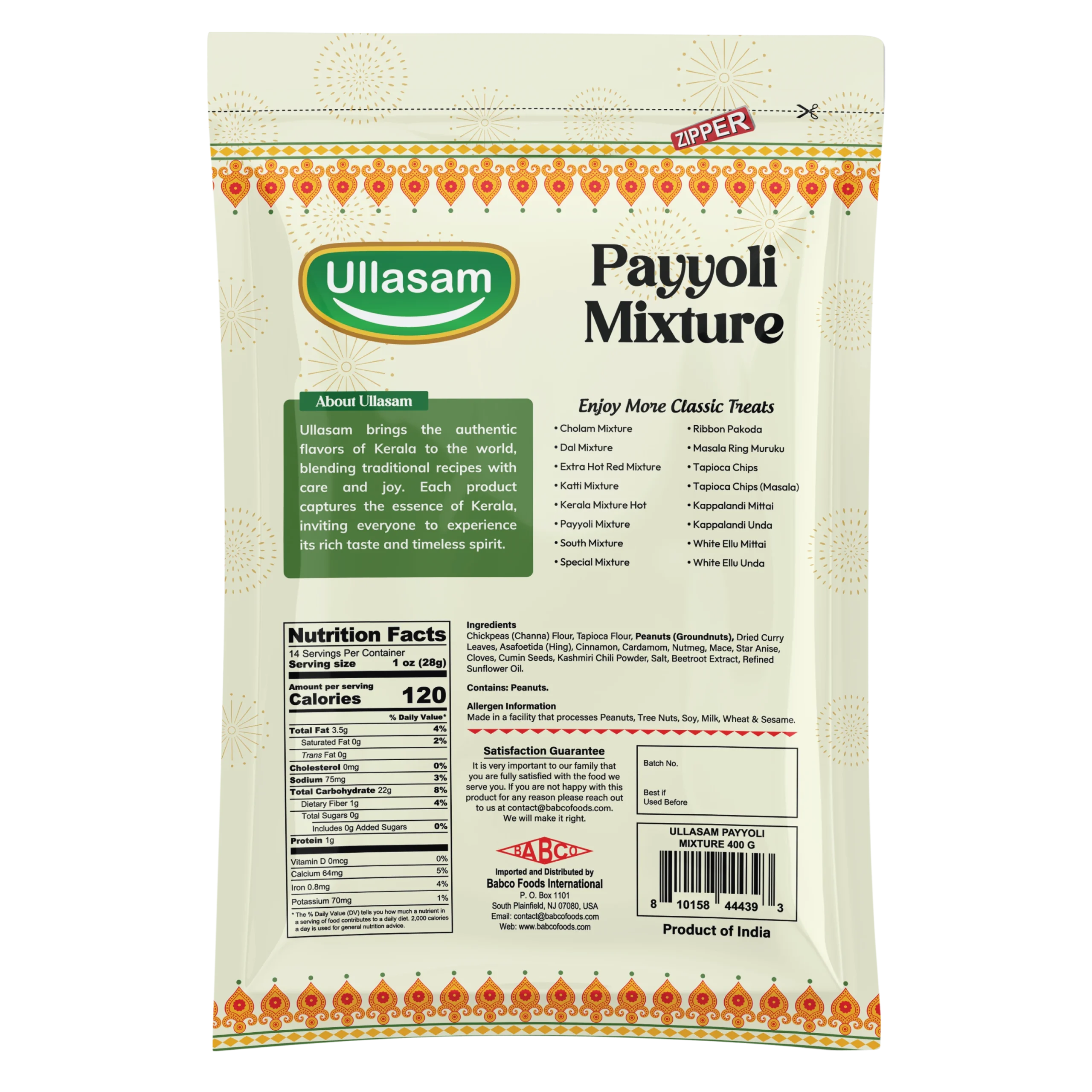 Chickpeas (Channa) Flour, Tapioca Flour, Peanuts (Groundnuts), Dried Curry Leaves, Asafoetida (Hing), Cinnamon, Cardamom, Nutmeg, Mace, Star Anise, Cloves, Cumin Seeds, Kashmiri Chili Powder, Salt, Beetroot Extract, Refined Sunflower Oil.
