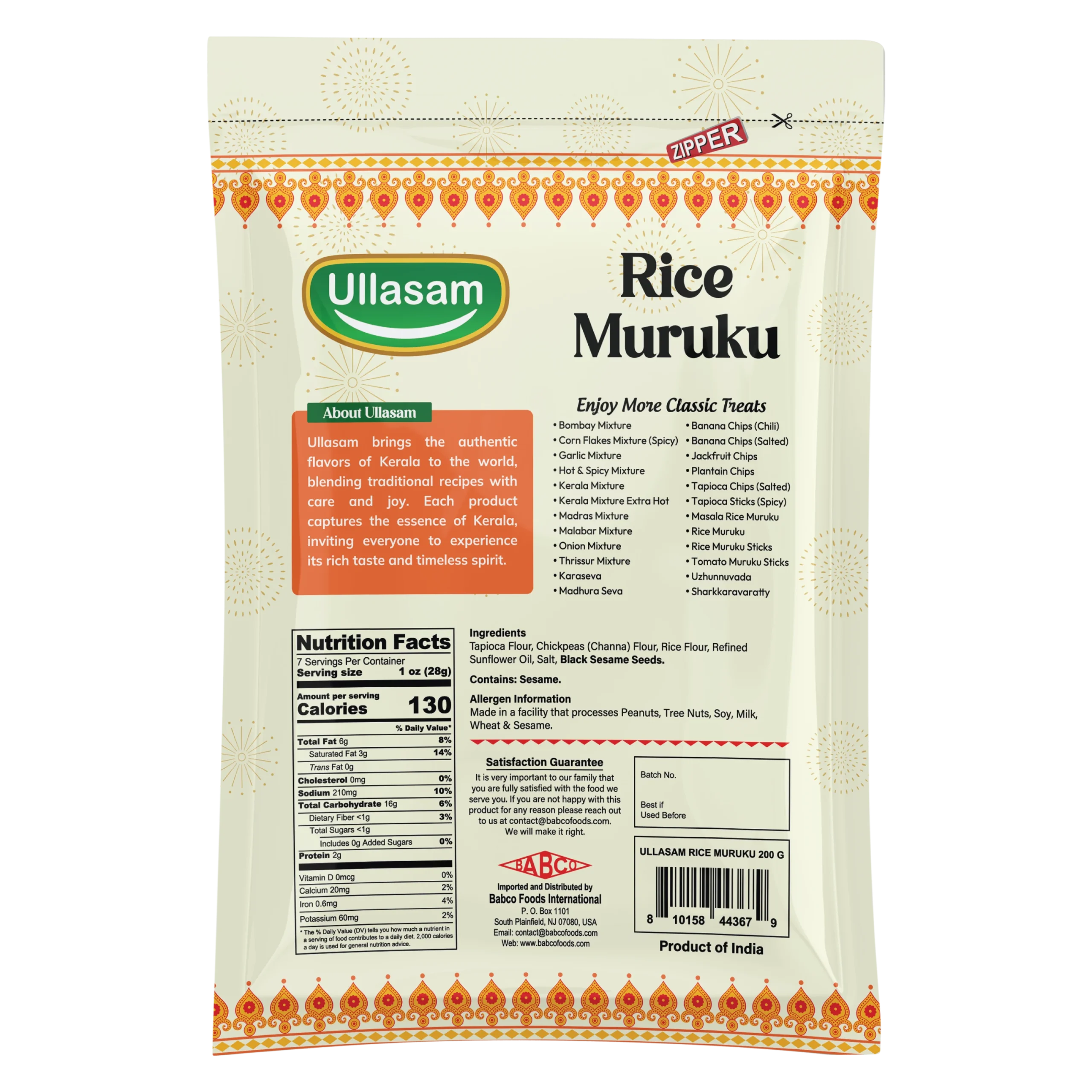 Ullasam Rice Muruku is a classic South Indian snack made from quality rice flour, seasoned lightly, and fried to crisp perfection. Known for its clean taste and satisfying crunch, it pairs perfectly with tea or works as an anytime snack. Ullasam Rice Muruku brings authentic homemade flavor and timeless South Indian snack tradition to every bite.