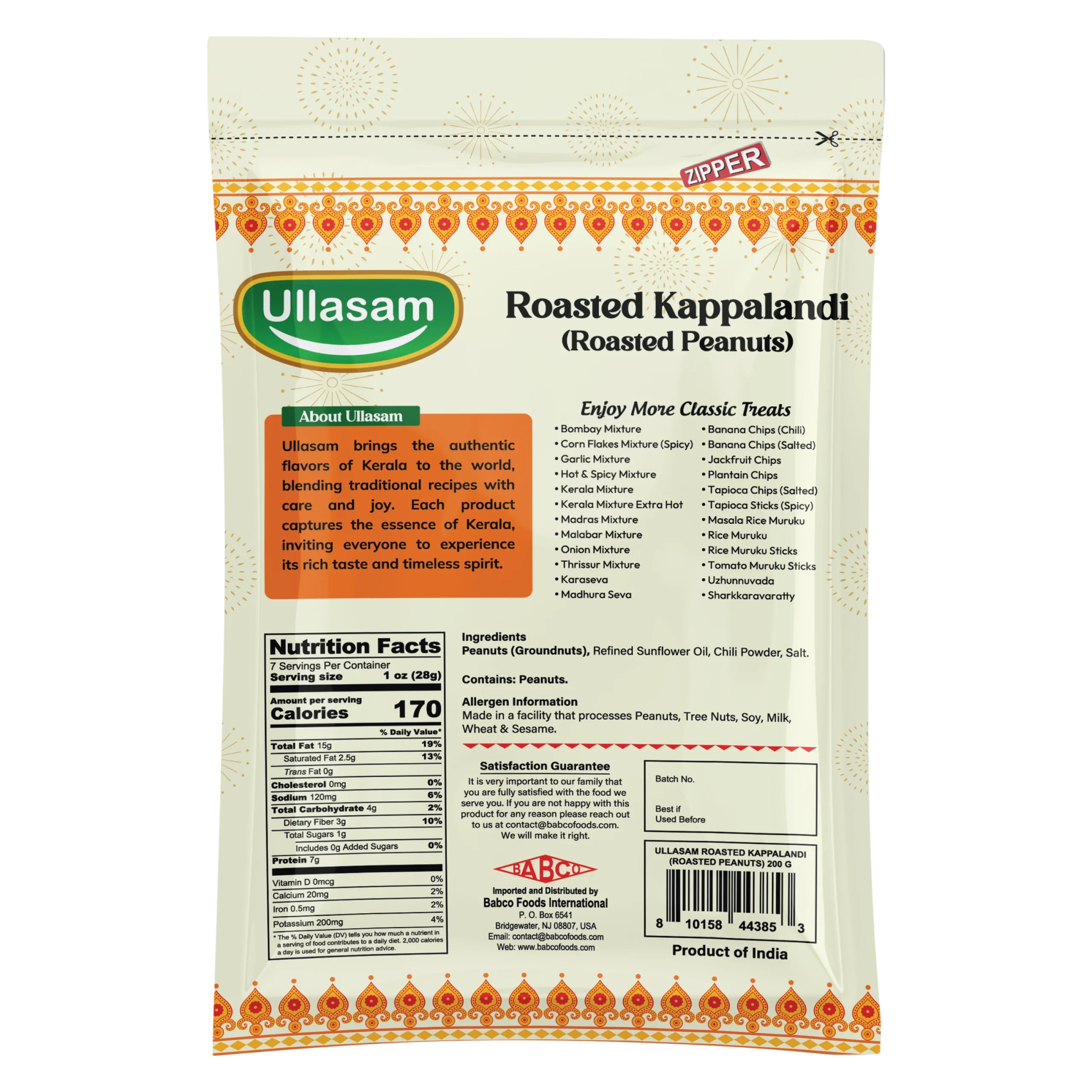 Ullasam Roasted Kappalandi (Roasted Peanuts) are premium-quality peanuts carefully roasted to bring out their natural nutty flavor and crunchy texture. Light, wholesome, and satisfying, they are perfect as an everyday snack or a traditional accompaniment to tea. Ullasam Roasted Kappalandi delivers simple goodness and authentic Kerala snack tradition in every handful.