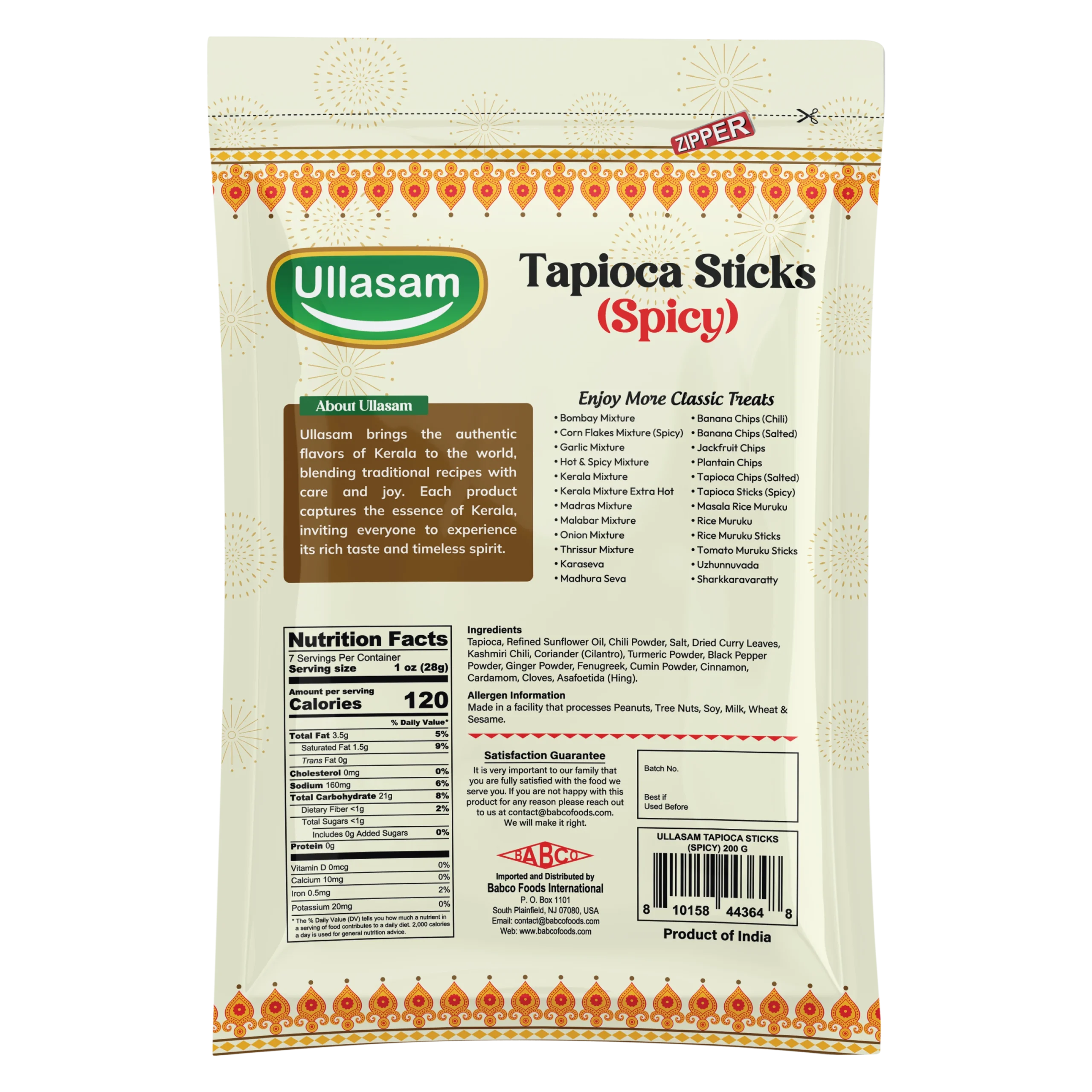 Ullasam Tapioca Sticks (Spicy) are crunchy, stick-shaped snacks made from fresh tapioca, fried to crisp perfection and seasoned with bold aromatic spices. Each bite delivers a satisfying crunch with a lively spicy kick that excites the palate. Ideal for tea-time or anytime snacking, Ullasam Tapioca Sticks (Spicy) bring authentic Kerala flavor and irresistible crunch to your snack moments.